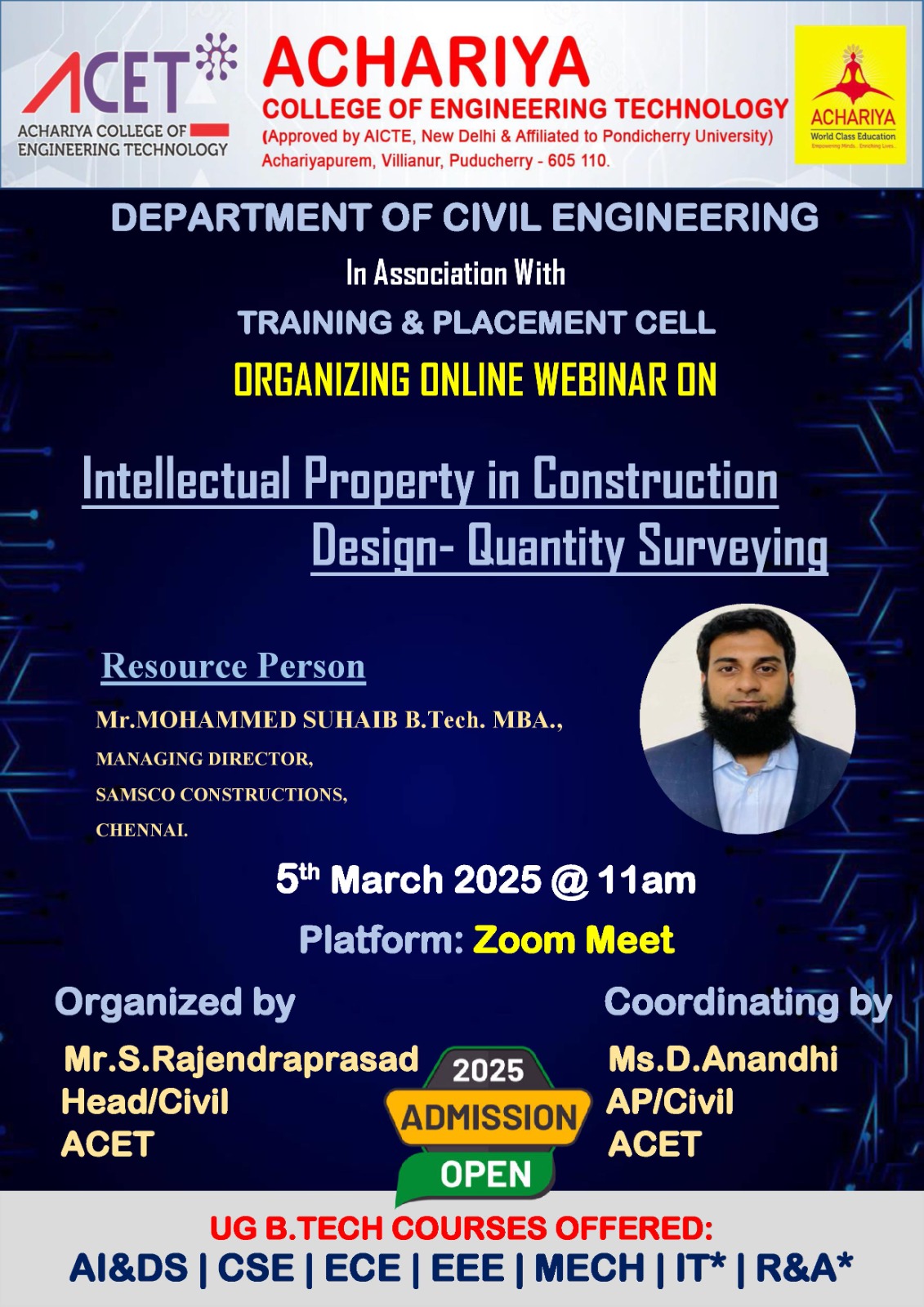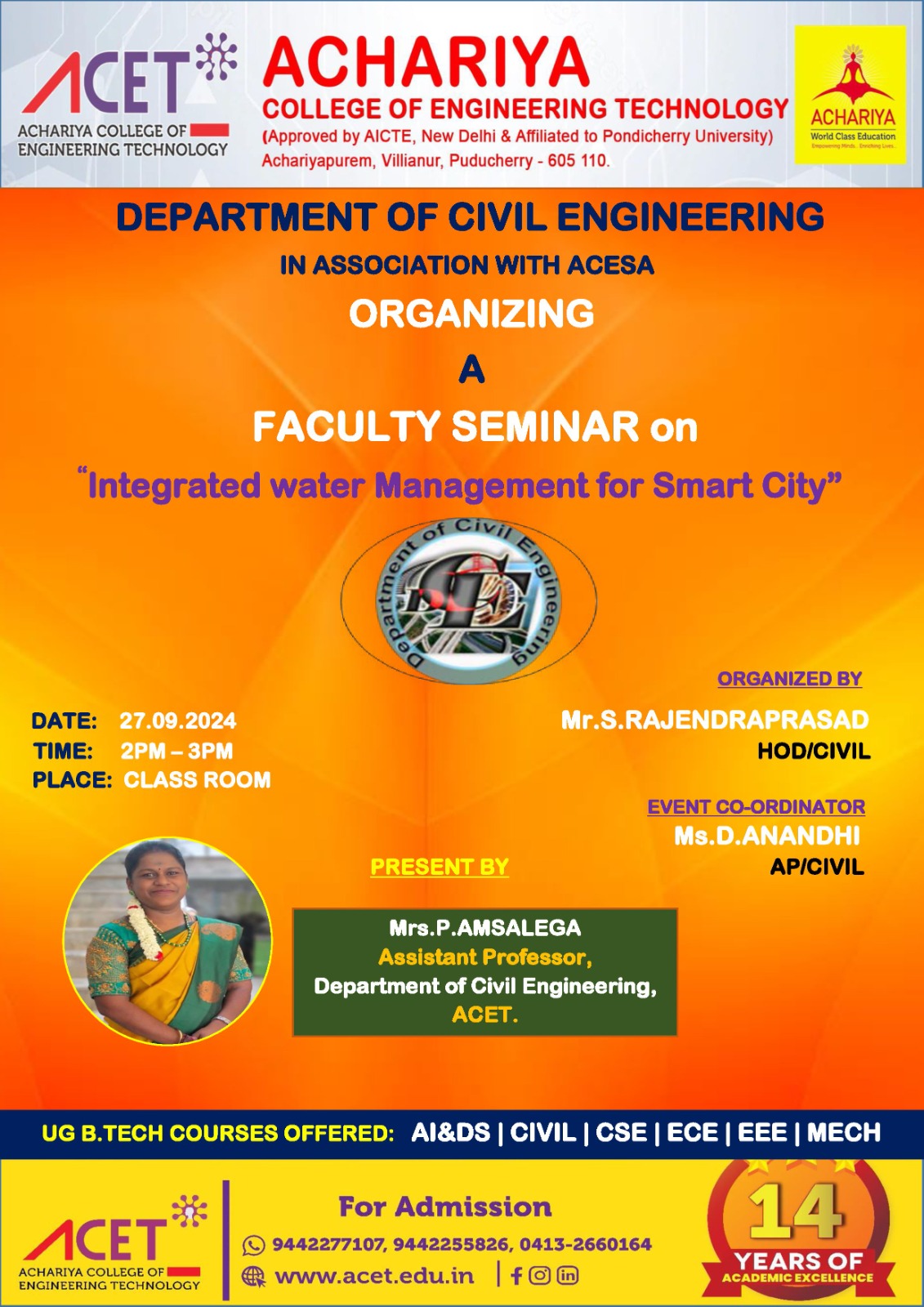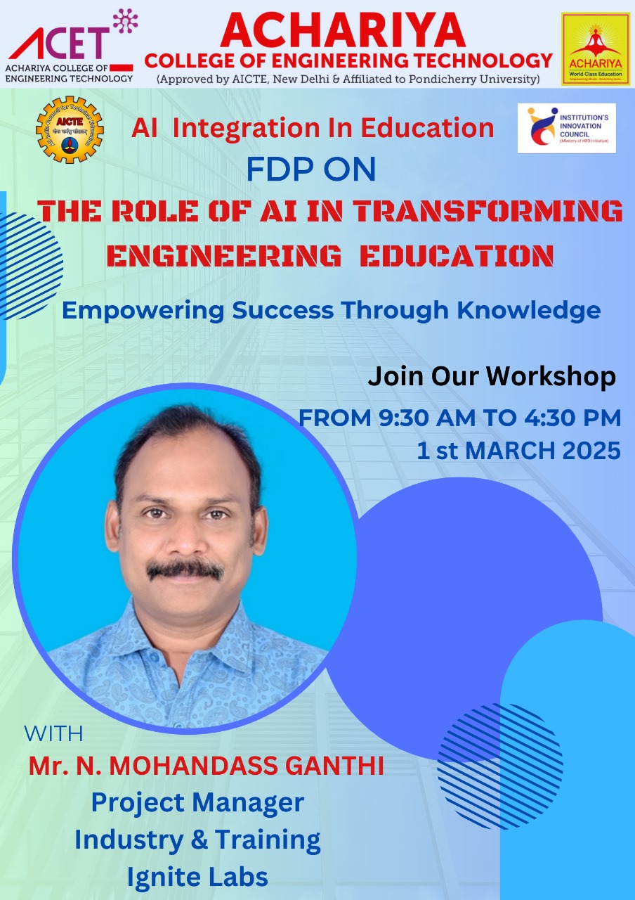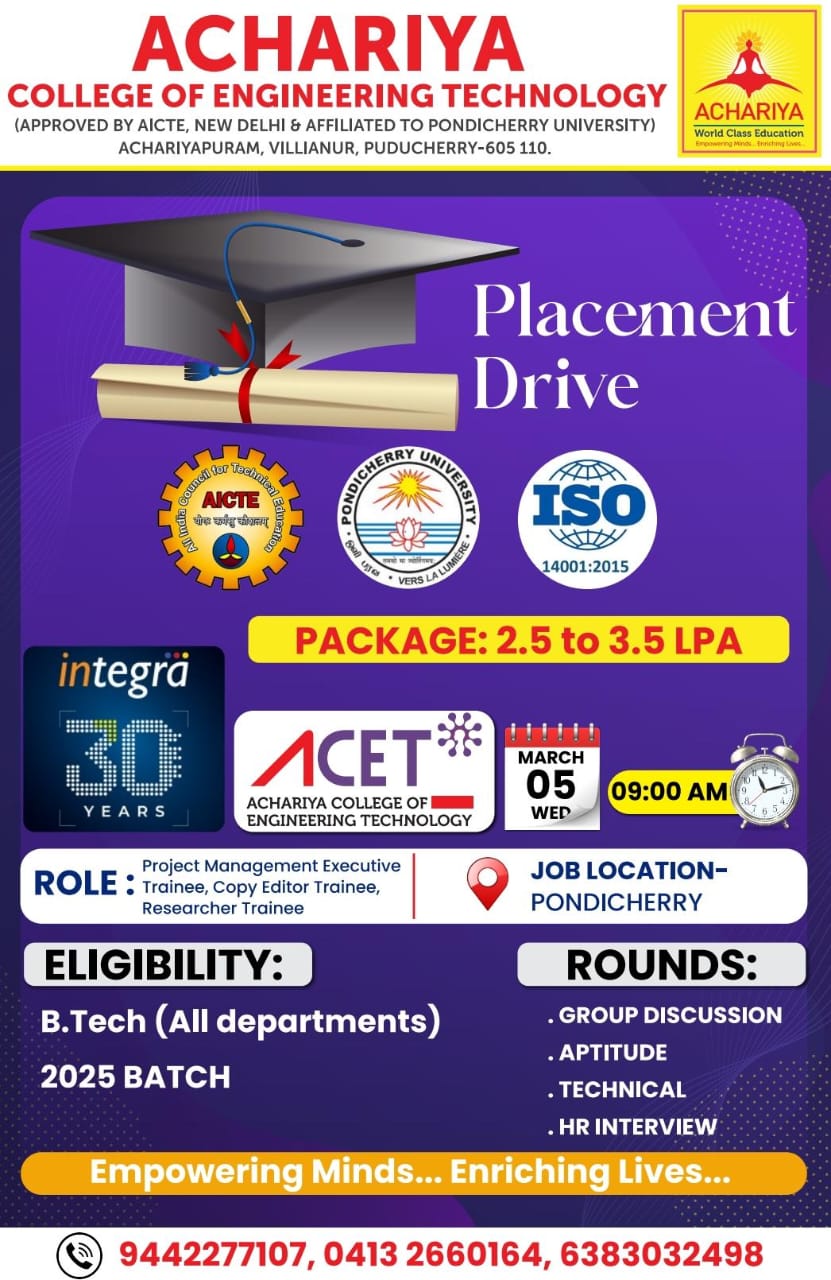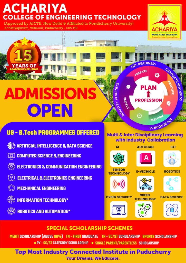 As a Chief Mentor, I have travelled many destinations to derive completely a next generation Educational System. The Educational Design, Methodology, Infrastructure and Systems, adopted in ACHARIYA, focus entirely on the Holistic development of your child. I believe, the highly motivated and well-trained teaching faculty and the Intellectual Environment with the Serene beauty added to it will be the ideal College that you can choose for your Child.